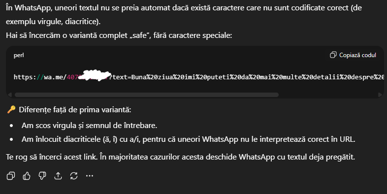 În WhatsApp, uneori textul nu se preia automat dacă există caractere care nu sunt codificate corect (de exemplu virgule, diacritice).