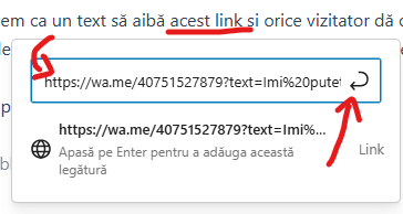 În WordPress, pur și simplu facem ca un text să aibă acest link și orice vizitator dă click pe el din telefon sau computer (dacă are WhatsApp for PC/Web), aplicația se va porni automat către numărul de telefon din cod și cu mesajul prestabilit de parametrul „text”.